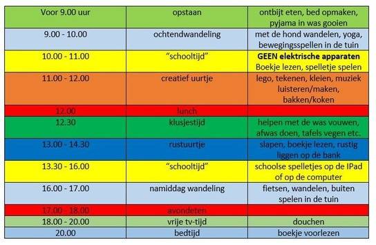 Om jullie de komende week te helpen met het dagelijks ritme en ideeën opdoen om spelenderwijs te oefenen met dingetjes uit de klas hebben we onderstaand schema opnieuw ingevuld en voorzien van nieuwe ideeën.